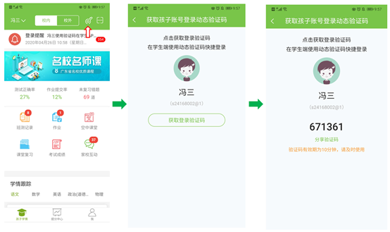 家长登录家长云APP,在【家校共育】模块点击右上角的钥匙图标,获取动态验证码。动态验证码有效期为10分钟。